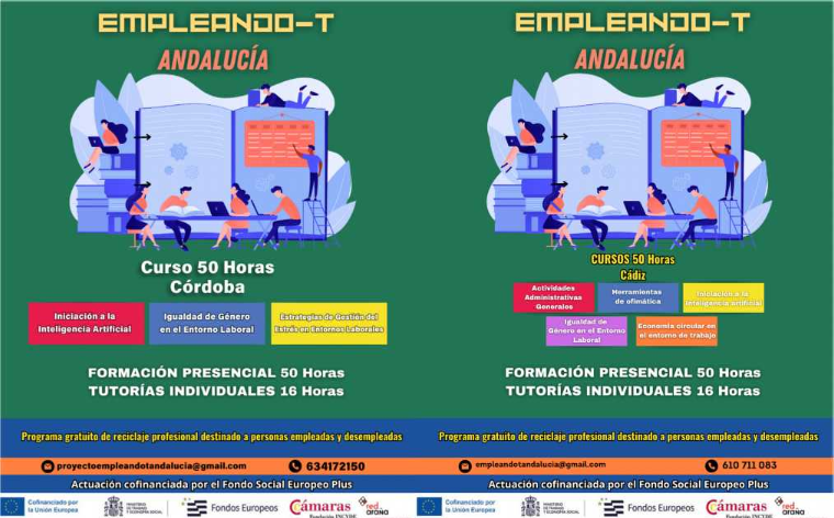 Empleando-T Andalucía es un programa concedido por Fundación Incyde y cofinanciado por el Fondo Social Europeo Plus. Está dirigido a personas empleadas y desempleadas que quieran mejorar sus habilidades laborales e incrementar sus probabilidades de mejoría en sus respectivos trabajos o en la búsqueda de nuevas oportunidades. El objetivo general es ofrecer oportunidades de Reciclaje profesional (Up-skilling y Re-skilling).